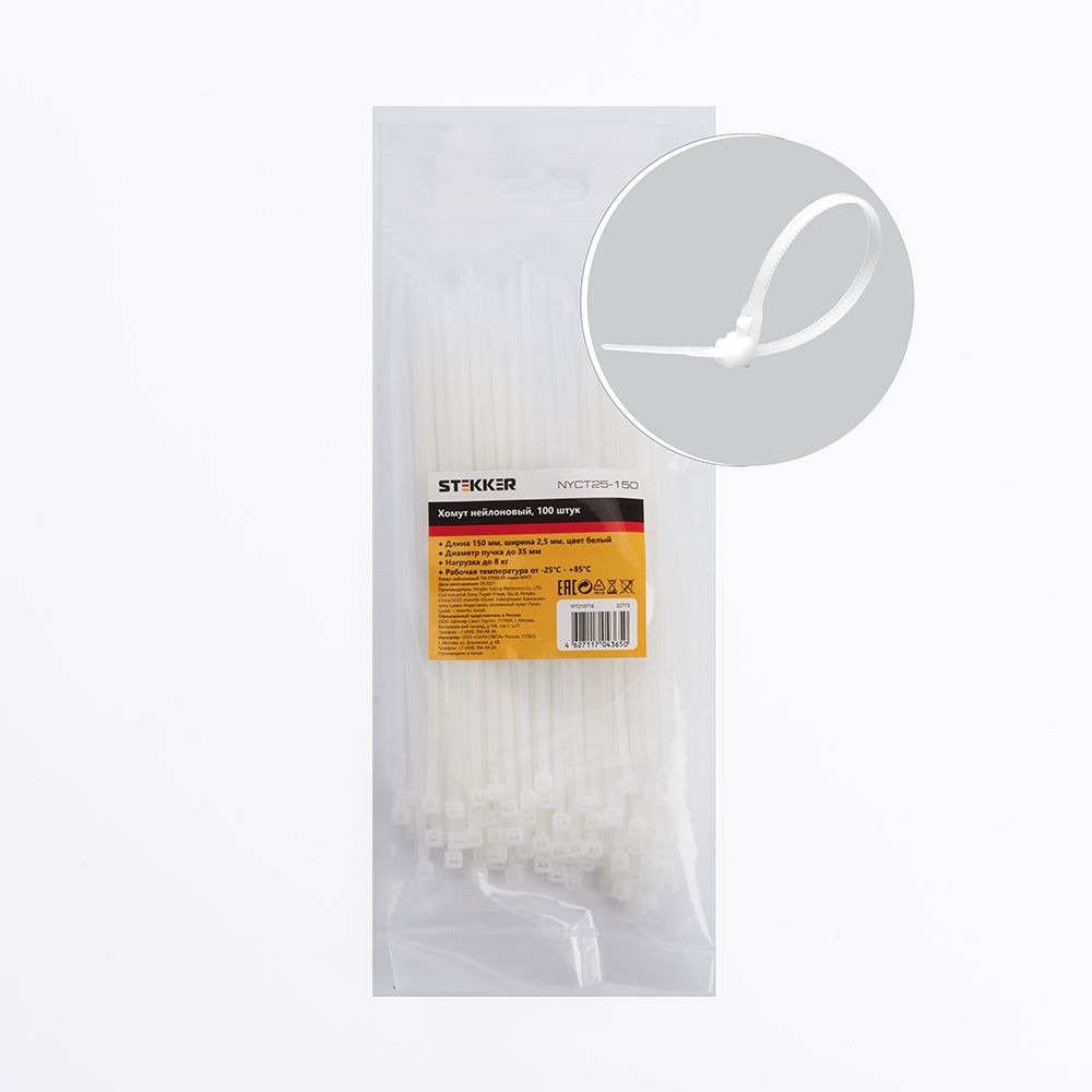 Хомут электромонтажный STEKKER NYCT25-150, одноразовый, белый, материал - нейлон , максимальный диаметр пучка - 35мм, нагрузка - 8кг, диапазон рабочих температур -25°C - +85°C, рекомендуемая температура хранениня +5°C - +25°C