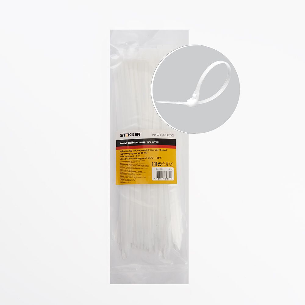 Хомут электромонтажный STEKKER NYCT36-250 , одноразовый, белый, материал - нейлон , максимальный диаметр пучка - 65мм, нагрузка - 18кг, диапазон рабочих температур -25°C - +85°C, рекомендуемая температура хранениня +5°C - +25°C