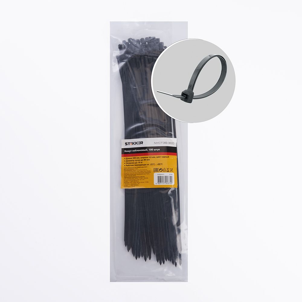 Хомут электромонтажный STEKKER NYCT36-300, одноразовый, черный, материал - нейлон , максимальный диаметр пучка - 80мм, нагрузка - 18кг, диапазон рабочих температур -25°C - +85°C, рекомендуемая температура хранениня +5°C - +25°C