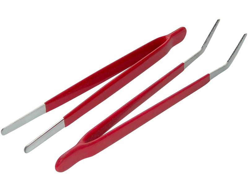 В наборе: пинцет прямой, пинцет с захватом под углом 45 градусов. Материал: инструментальная сталь, ПВХ ручки.