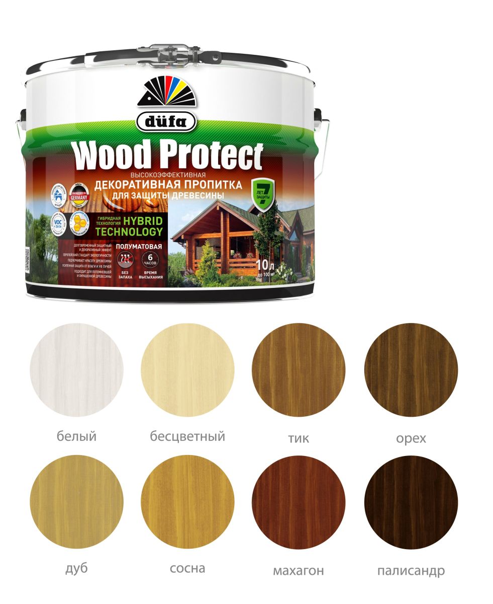 Декоративная, погодостойкая и грязеотталкивающая высокоэффективная пропитка для дерева с повышенной сопротивляемостью погодным факторам на акрилово-алкидной основе. Новая технология пропитки düfa Wood Protect объединяет в себе свойства глубоко проникающей эмульсии на основе алкидной смолы с образующей пленку акрилатной дисперсией. Твердый воск и натуральные масла, находящиеся в составе, способствует водонепроницаемости, прочности и гидрофобному эффекту поверхности. Такая комбинация дает непревзойденное сочетание долговременной защиты и экологичности, особенно в момент нанесения – как в ручную, так и методом распыления. Входящий в состав твердый воск проникает в структуру древесины и повышает ее износостойкость. Пропитка обладает тиксотропной консистенцией, которую в обиходе называют кремо- или гелеобразной. Одобрена для покрытия детских игрушек, кроваток, мебели и пр.
